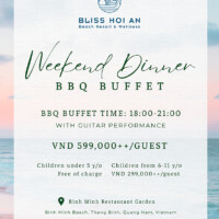 Le cadre romantique, la cuisine délicieuse et le service professionnel vous garantissent une soirée parfaite pour vous et votre famille. Lors de votre séjour au Bliss Hoi An, ne manquez pas le festin BBQ Beachcomber tous les samedis soirs !